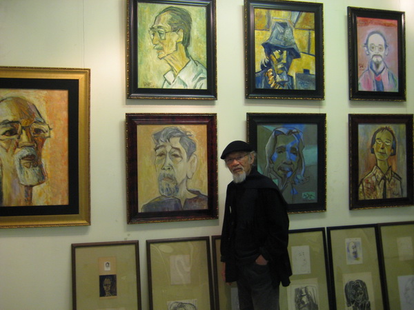 Họa sĩ Bùi Quang Ngọc bên các tác phẩm của mình