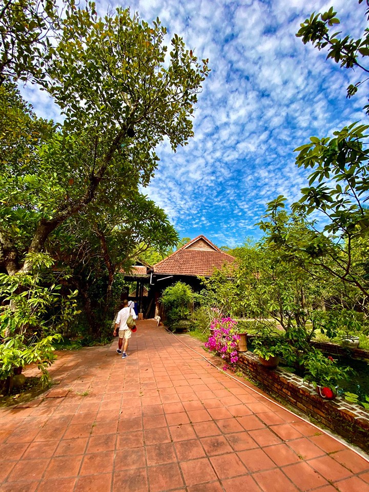 Khu vườn được quy hoạch rất đẹp, có hồ cá, có giếng nước, vườn cây, hoa, cây ăn trái. Có nhiều cây như Sala cổ thụ đang nở hoa, cây Vạn tuế trên 400 năm được bà mua từ ngoài Bắc vào, “Cây này trên 400 năm, đúng thời gian này ra hoa đấy.” Bà giới thiệu ý là chúng tôi may mắn được chiêm ngưỡng. Trong vườn, nhiều loại cây hoa lá quý, đẹp được quy hoạch kỹ lưỡng tạo cho khách tản bộ có cảm giác thanh bình và gần gũi mà tinh tế dưới tán các cây xanh.