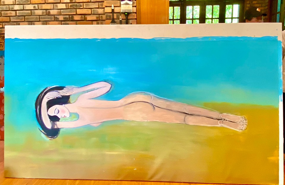 Đi qua khu vườn, bà dẫn chúng tôi xuống nhà phía dưới, một phòng như là bếp với hàng chồng bát đĩa sứ, chắc đủ cho một nhà hàng hay bữa tiệc đông người, trong phòng còn có rất nhiều các khung tranh gỗ. Bên phải là một phòng rộng, trên đường dẫn vào phòng, nhiều bức vóc đang được bó sơn và phơi “Gỗ vóc được quấn lớp vải và sơn ta trộn với đất phù sa ngoài Bắc trát kỹ ” Phan Sang, hoaj sĩ trẻ đi cùng giải thích, đây là vóc bà chuẩn bị cho các tác phẩm của mình, tự mình chuẩn bị vóc các công đoạn sơn luôn. Trong phòng là xưởng vẽ, cũng là nơi có thể tiếp khách. Bên cạnh nhiều bức sơn mài đang vẽ, khá nhiều bức sơn dầu vẽ thiếu nữ rất đẹp. “Một kiểu của trường phái Kiểu cách là một trào lưu hội họa xuất hiện vào năm 1503 và kéo dài trong một thế kỷ. Tên gọi 'Kiểu cách' (mannerism) có nguồn gốc từ tiếng Ý 'maniera' (nghĩa là 'kiểu cách'). Nó phản ánh phong cách cường điệu và phóng đại của nghệ sĩ đương thời. ” Họa sĩ Thu Hằng giới thiệu về bức sơn dầu thiếu nữ với tay chân và cổ được kéo dài tạo hiệu ứng. Các bức vẽ thiếu nữ của bà rất đáng yêu và đầy nữ tính cùng vói chất Huế, có nét buồn sâu thẳm mà kiêu sa… “Có vẻ đây là các bức vẽ với mẫu là cô con gái của bà.” Họa sĩ Thu Hằng nói.