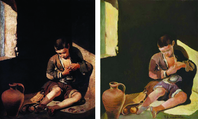 Bức tranh có chữ ký ‘Tô Ngọc Vân’ trên sàn đấu giá Chrisite’s Hong Kong ngày 28/5/2017 (phải) bị nghi ngờ là tranh nhái bức tranh “The Young Beggar” của Bartolome Esteban Murillo (trái). Trong catalogue của nhà đấu giá, ở mục “Nguồn gốc xuất xứ” ghi rằng ‘Acquired directly from the artist by Claude Mahoudeau, Hanoi, 1943’ và ‘Private collection, Paris, France’ (tạm dịch: ‘Claude Mahoudeau mua trực tiếp từ họa sỹ, Hà Nội, 1943’ và ‘Sưu tập cá nhân, Paris, Pháp’ (?!). ©Artble/Christie’s