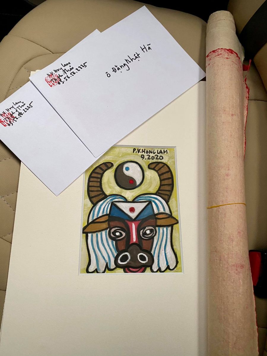 “Các anh ra chọn trâu đi, 250 bức nhưng họ lấy gần hết rồi, còn đây là quà đặc biệt tặng riêng hai anh nhé.” Họa sĩ giục chúng tôi chọn tranh trâu bột màu trên giấy dó và đưa cho mỗi chúng tôi một bức lụa nhỏ rất đẹp được bo viền sẵn sàng. Cùng thêm một bưu thiếp Năm mới cũng trên lụa như những tác phẩm thử nghiệm cho các cuộc triển lãm sắp tới.