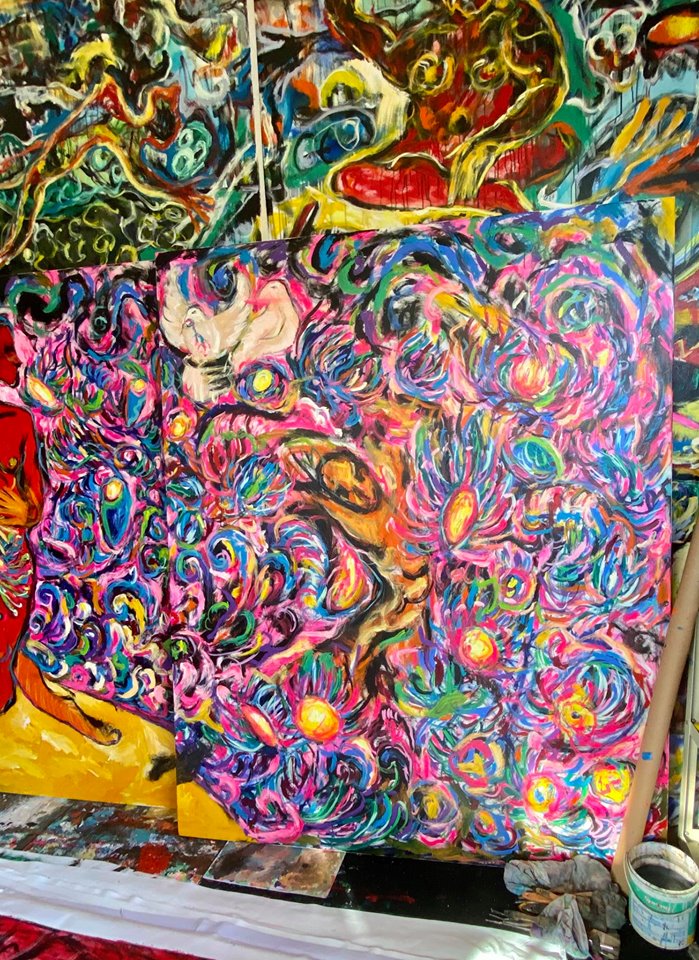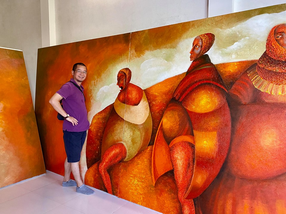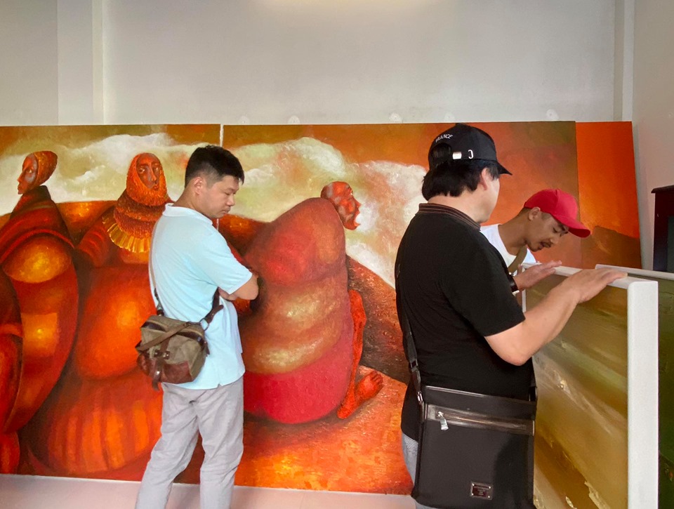 Nội dung, tác phẩm của Sang vẫn theo phong cách từ năm ngoái, rất áp đặt đến mức trấn áp người xem từ nội dung, gam màu, khổ tranh... " thời gian cách ly Covid, em vẽ một loạt tranh phụ nữ" Sang lôi hơn chục bức tranh phụ nữ ra cho chúng tôi xem, vẫn phong cách đang vẽ, phụ nữ được mô tả từng trạng thái, thân phận thông qua tư thế, màu sắc thay vì đặc tả chi tiết...