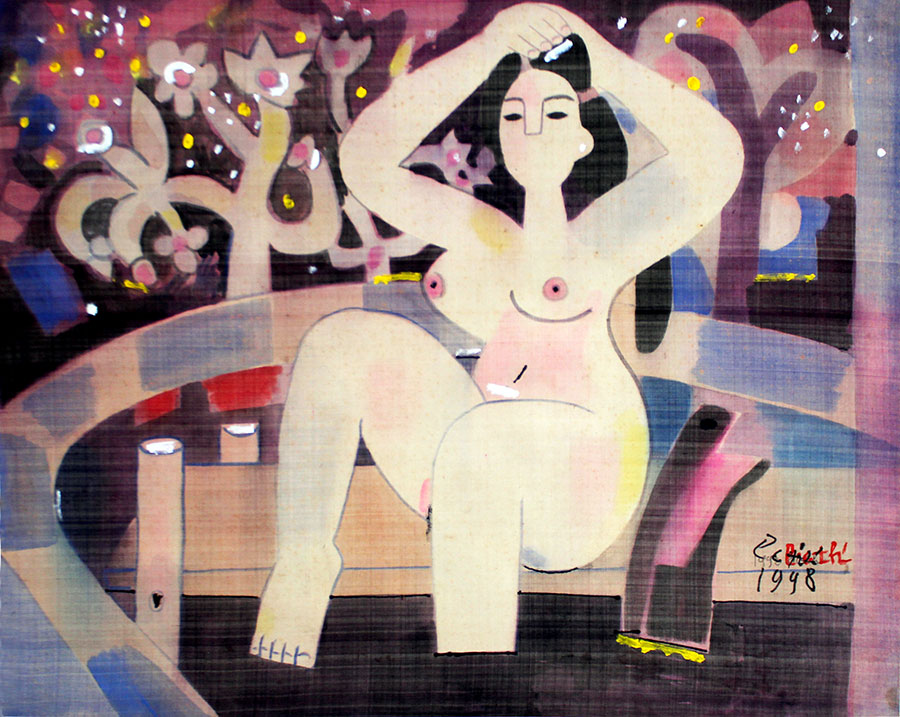 Hoạ sỹ, nhà điêu khắc Lê Công Thành vẽ hai tác phẩm “Nude” và “Mẹ con” từ năm 1996 – 1998 trên chất liệu lụa.